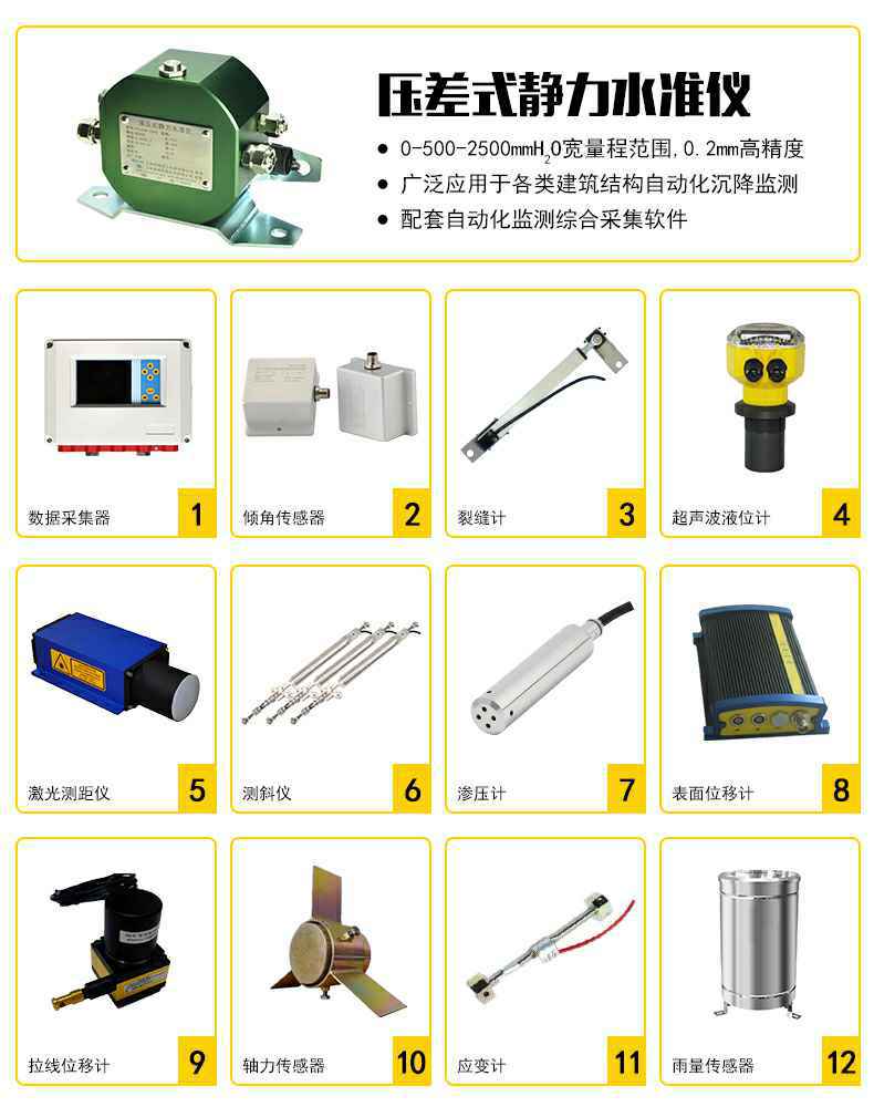 静力水准仪是一种高精密液位测量仪器,用于测量基础和建筑物各个测点的相对沉降。应用工地包括大型建筑物,如水电站厂、大坝、高层建筑物、核电站、水利枢纽工程,铁路、地铁、高铁等各测点不均匀沉降的测量